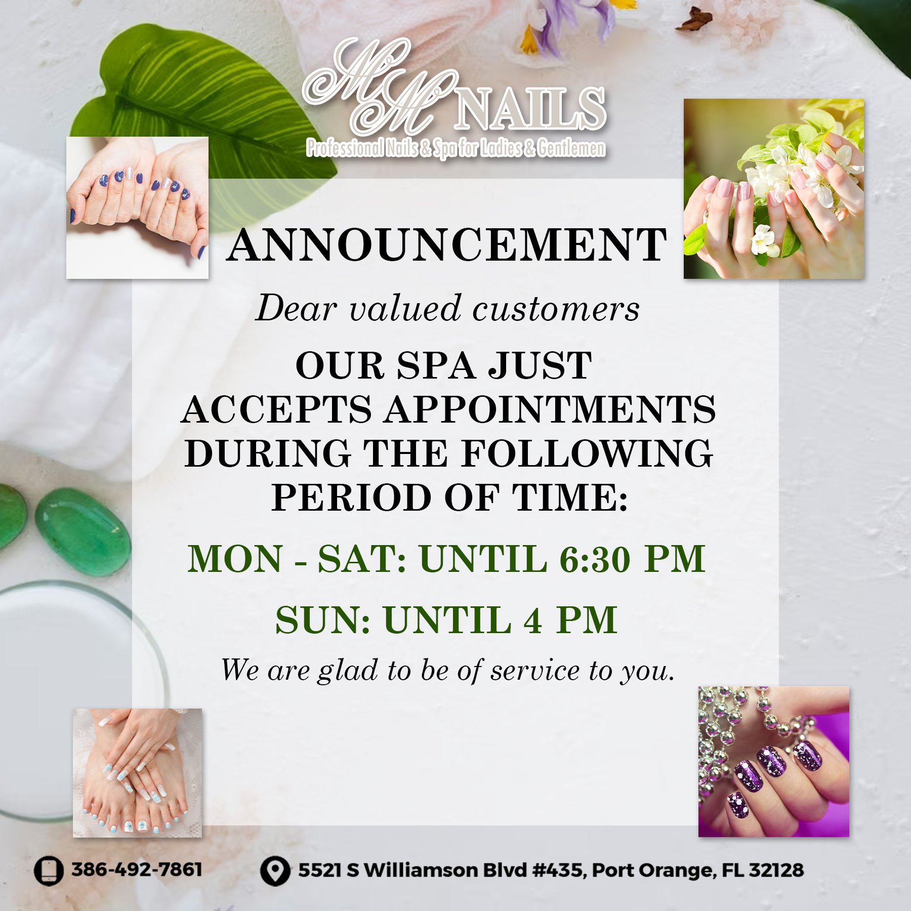M-M NAILS SPA is a top-notch nail salon and spa in Port Orange, FL 32128. Our nail salon is the most affordable and professional. We focus on customer safety, needs, and satisfaction.